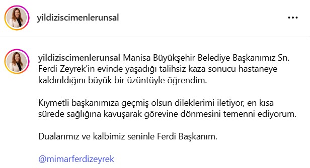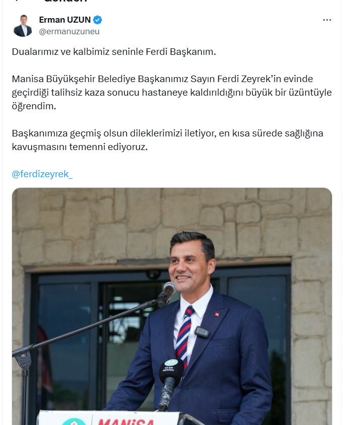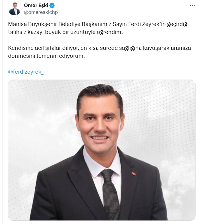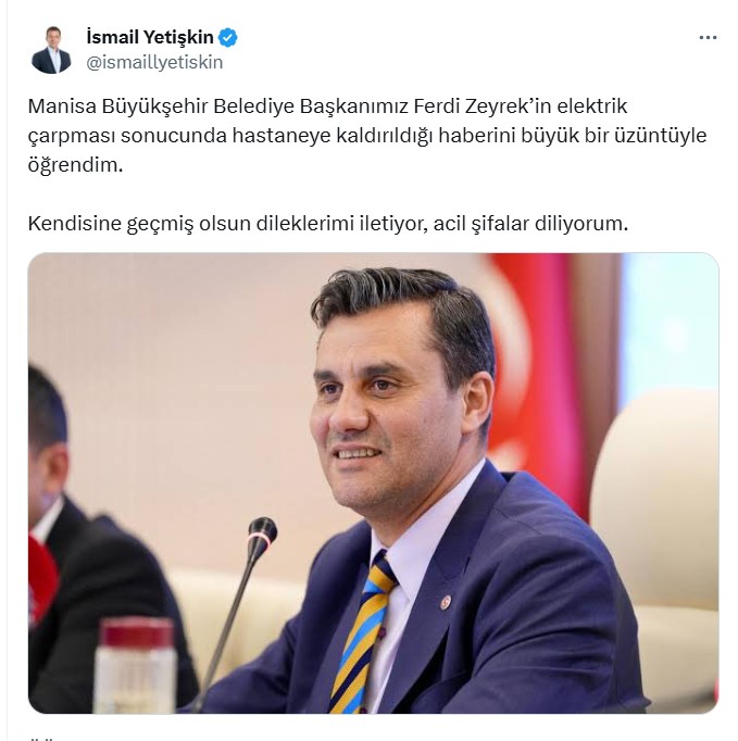 Olay, saat 23.45 sıralarında Güzelyurt Mahallesi'ndeki bir sitede meydana geldi. İddiaya göre, Manisa Büyükşehir Belediyesi Başkanı Ferdi Zeyrek, oturduğu sitede yer alan havuzun makine dairesindeki arıza ile ilgilenirken elektrik çarptı. Yakınlarının durumu bildirmesi üzerine adrese sağlık ekipleri sevk edildi. Ambulansa alınan Başkan Zeyrek, Celal Bayar Üniversitesi Hastanesi'ne kaldırıldı.