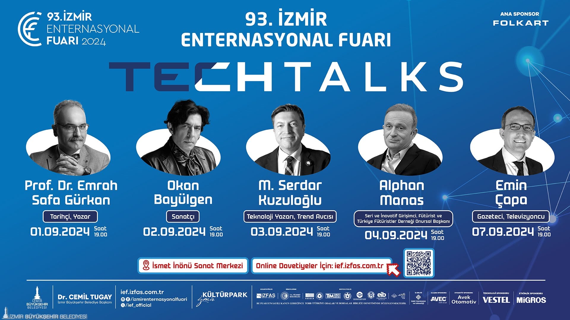 İZFAŞ ve İzmir İnovasyon ve Teknoloji AŞ’nin birlikte düzenlediği ‘Tech Talks’ isimli söyleşilerde, Türkiye’nin merakla, ilgiyle, bilgilenerek dinlediği isimler, İsmet İnönü Sanat Merkezi’ndeki Tech Talks etkinliğinde buluşacak. 1 Eylül günü tarihçi, akademisyen Prof. Dr. Emrah Safa Gürkan, 2 Eylül’de sanatçı Okan Bayülgen, 3 Eylül’de teknoloji yazarı, trend avcısı Serdar Kuzuloğlu, 4 Eylül’de seri ve inovatif girişimci, fütürist ve Türkiye Fütüristler Derneği Onursal Başkanı Alphan Manas, 7 Eylül’de gazeteci ve televizyoncu Emin Çapa konuşmacı olarak yer alacak.