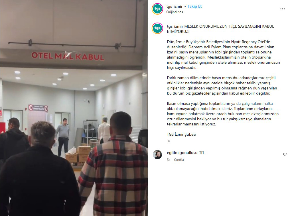 İstinyaPark İzmir Otel'de dün basına yapılan saygısızlığı, olaya birebir şahit olarak, yazdığımız haberde bahsetmiştik. Ne yazık ki yaşanan bu saygısızlığa ve küçük düşürücü harekete TGS'den (Türkiye Gazeteciler Sendikası) İzmir Şubesi tarafından eleştiri ve kınama yazısı gelirken, İzmir Gazeteciler Cemiyeti'nden hiçbir açıklamama gelmemesi de ayrı bir eleştirilecek konudur.