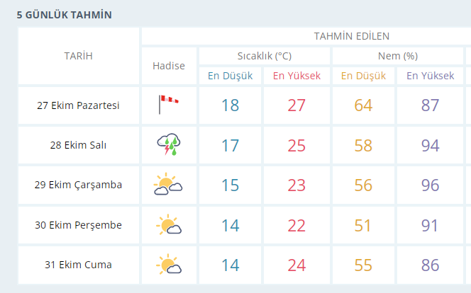 Meteoroloji verilerine göre, 27 Ekim Pazartesi günü 27 derecelerin etkili olacağı beklenirken, hafta genelinde sıcaklık 23 derecelerde olacağı tahmin ediliyor.