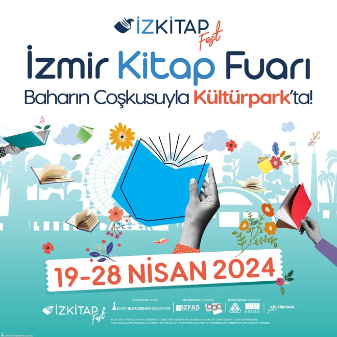 İzmir Büyükşehir Belediyesi'nin ev sahipliğinde İZFAŞ ve SNS Fuarcılık iş birliği ile düzenlenen İZKİTAP - İzmir Kitap Fuarı, 19-28 Nisan 2024 tarihleri arasında festival gibi bir organizasyonla Kültürpark’ta okuyucuyla buluşuyor. Girişin ücretsiz olacağı İzkitapfest, saat 10.00 ile 21.00 saatleri arasında ziyaret edilebilecek.