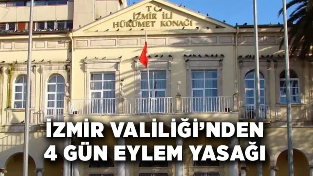 2911 Sayılı Toplantı ve Gösteri Yürüyüşleri Kanunun 17. ve 19. maddeleri ile 5442 Sayılı İl İdaresi Kanunun 11. maddesi hükümleri gereğince; 'Demokratik Siyasette Israrcıyız! Halkların Dayanışması ve Birleşik Mücadele İle Kumpasları Aşacağız, 6-8 Ekim Terör Olaylı davası' ile ilgili yapılması muhtemel her türlü açık yer toplantıları ile gösteri yürüyüşleri, toplu olarak karşılama ve uğurlama merasimleri, basın açıklaması, oturma eylemi, miting, çadır kurma, imza kampanyası, stant açma, anma töreni, şenlik, konser, eğlence, oyun, gösteri vb. türdeki tüm eylem ve etkinliklerin İzmir il merkezi ve ilçeler dahil olmak üzere, tüm il sınırları içerisinde (Coğrafi Alan-İl Merkezi, İlçeler/Polis ve Jandarma sorumluluk bölgelerinin tamamı) 16.05.2024 günü saat 17.30'dan 19.05.2024 günü saat 23.59’a kadar 4 (dört) gün süreyle yasaklama kararı alınmıştır."