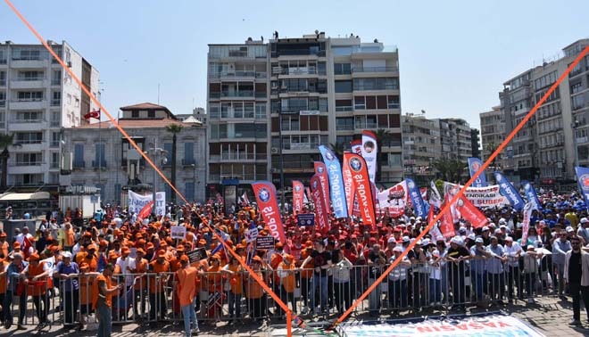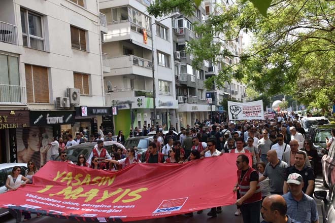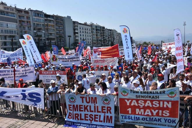 Türk-İş Ege Bölge Temsilcisi Hayrettin Çakmak ise Anayasa'da tanımlanan demokratik, laik ve sosyal hukuk devletinin işler hale gelmesi için mücadele edeceklerini belirterek, "Gelecek, işçi sınıfının ve tüm emekçilerin ellerinde yükselecektir. Bizler sadece işçilerin değil, tüm emekçilerin, kadınların, çocukların ve ötekileştirilen tüm kesimlerin, doğanın ve tüm canlıların haklarını sonuna kadar savunacağız. İnsan onuruna yaraşır koşullarda yaşayabilmek için azim ve kararlılıkla kavgamızı sürdüreceğiz" dedi.