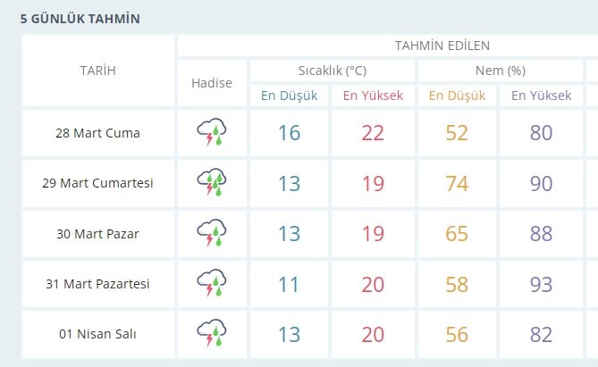 Meteoroloji verilerine göre; 28 Mart - 1 Nisan 2025 tarihlerinde İzmir'de gökgürültülü ve sağanak yağış etkili olacağı tahmin ediliyor.