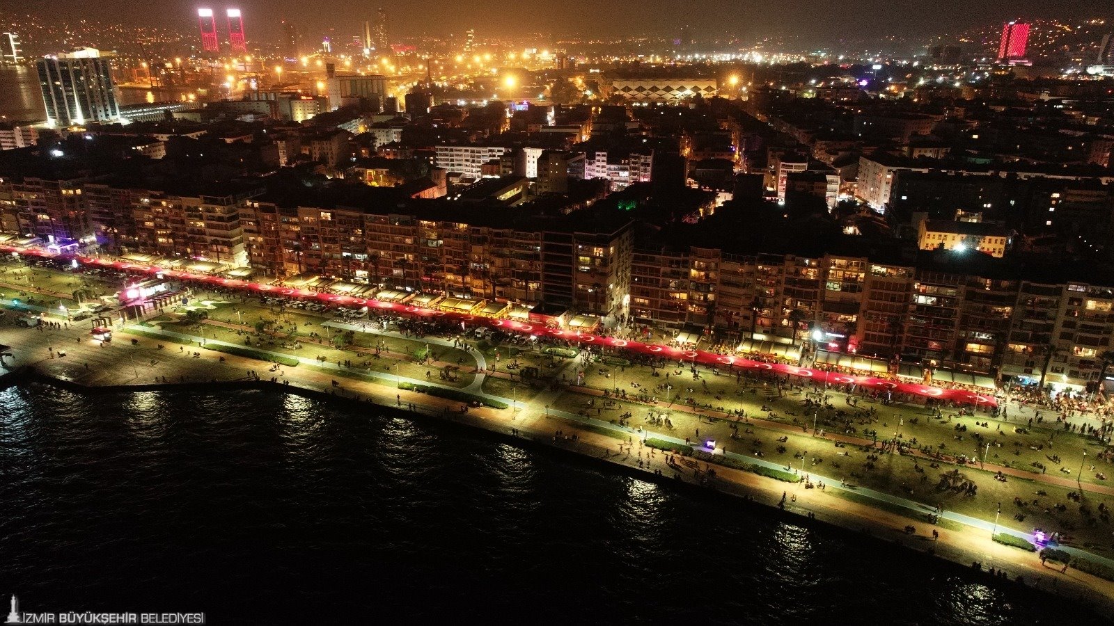 Cumhuriyet Bayramı kutlamaları kapsamında İzmir Büyükşehir Belediyesi Gençlik ve Spor Hizmetleri Dairesi Başkanlığı organizasyonunda önemli bir etkinlik de yapılacak. Protokol ve yurttaşlardan oluşan kortej, Konak Saat Kulesi önünde toplanarak saat 19.45’te Karşıyaka Belediyesi Bandosu eşliğinde Alsancak istikametine doğru yürüyecek. Kortej, Konak Pier AVM’nin önünde 350 metrelik Türk bayrağı ve fener alayı ile birleşecek ve dev yürüyüş 1. Kordon’a doğru devam edecek. Marşların söyleneceği kortejde bu yıl ilk kez İzmir’de faaliyet gösteren spor kulüplerinin temsilcileri de yer alacak. İzmir Büyükşehir Belediyesi Spor Kulübü, Altınordu ve Göztepe’nin yanı sıra Amatör Spor Kulüpleri Federasyonu’na bağlı bazı kulüpler de korteje katılacak. Saat 20.30’da da Cumhuriyet Meydanı’nda havai fişek gösterisi var.