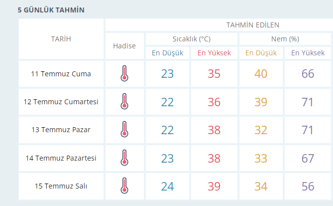 Meteoroloji verilerine göre, 11 Temmuz Cuma günü sıcaklık 35 dereceyi gösterirken, hafta sonu için de uyarı yapıldı.