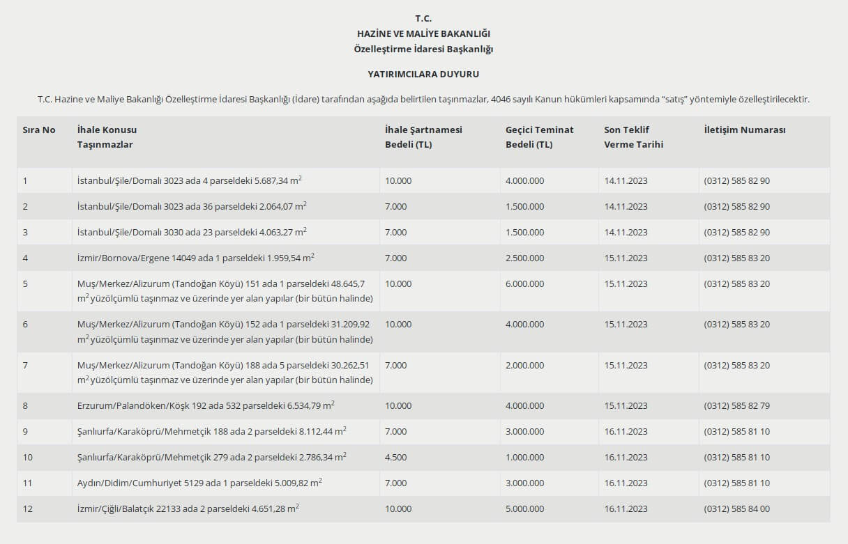 Buna göre, İstanbul'un Şile ilçesinde 3, İzmir'in Bornova ve Çiğli ilçelerinde birer, Muş'un merkez ilçesinde 3, Erzurum'un Palandöken ilçesinde 1, Şanlıurfa'nın Karaköprü ilçesinde 2 ve Aydın'ın Didim ilçesinde bir olmak üzere toplam 12 taşınmazın satışı yapılacak.