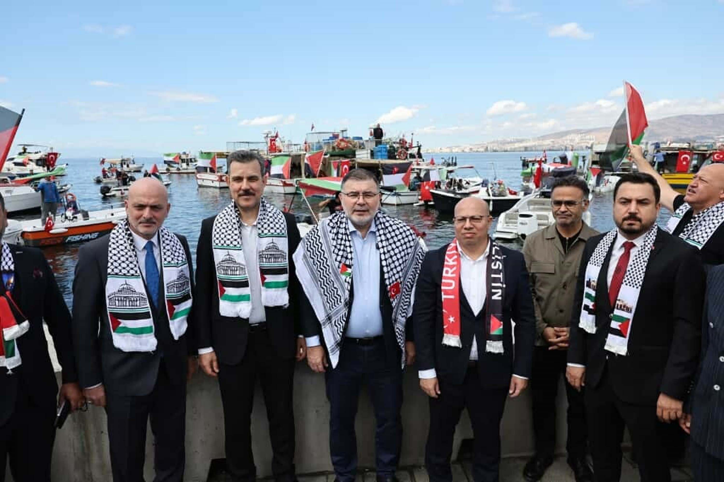 7 noktadan denize açılan tekneler Cumhuriyet Meydanı'nın önündeki Pasaport İskelesi'nde bir araya geldi. Bostanlı, Güzelbahçe 2, Güzelbahçe Yalı, Güzelbahçe 1, Sahilevleri, İnciraltı ve Mavişehir balıkçı barınaklarından sabah saatlerinde denize açılan tekneleri, meydanda toplanan vatandaşlar karşıladı. Sık sık tekbir getiren, aralarında çocukların da bulunduğu topluluk 'Nehirden denize özgür Filistin' sloganları attı. Etkinlikte Gazze ve Filistin'e destek mesajları verildi. Filistin'e Destek Platformu adına konuşan İzmir Sivil Toplum Kuruluşları (İSTOK) Dönem Başkanı Gökhan Temur, küresel Sumud Filosu'nun bir vicdan hareketi olduğunu dile getirdi. Gemilerde silah ve tehdit bulunmadığını söyleyen Temur, "O gemilerde mazlum çocukların sütü, annelerin ekmeği, babaların umudu, kardeşlerimizin vicdanı vardır. Zalim İsrail uluslararası hukuk ve insanlık değerlerini hiçe sayarak sivil inisiyatifi katletti. Bu saldırı yalnızca bir deniz haydutluğu değil insanlığın merhametine ve onuruna vurulmuş bir darbedir. Açlığa, kuşatmaya ve ölüme direnen bir halkın sesini susturmaya yönelik alçakça bir girişimdir. Hepimizin yüreğinde bir daha kapanmayacak derin bir yara açmıştır" dedi. Adaletin, insanlığın ve umudun rotasından hiçbir zaman sapmayacaklarını belirten Temur, Gazze kara sularına fiilen ulaşıldığını hatırlatıp, son gemide İsrail'in tutsağı durumunda 2'si İzmir'den 14 vatandaşın bulunduğunu ifade etti.