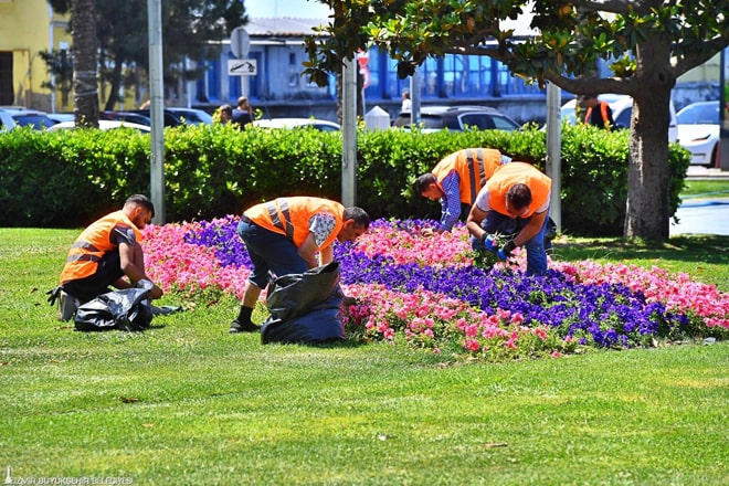 Kent estetiği için peyzaj çalışmalarına ağırlık veren İzmir Büyükşehir Belediyesi, yaz ayları öncesi kentin sokak, cadde ve meydanlarını çiçeklerle donattı. Park ve Bahçeler Dairesi Başkanlığı tarafından yürütülen çalışmalar kapsamında orta refüjlerde, tretuvarlarda, ana güzergâhlarda, kentin giriş ve çıkış noktalarında, kavşak ve meydanlarda çiçeklendirme çalışması yapıldı. Petunya, sunpatiens, begonya, kadife, vapurdumanı gibi yazlık bitkiler, godetya, karanfil, menekşe gibi kışlık mevsimlik çiçek türleri kullanıldı. Mevsimlik çiçeklerin yanı sıra su tasarrufu sağlayan Bodrum papatyası gibi uzun ömürlü yer örtücü, ılgın, zakkum, kuşdili gibi çalı bitkileri, sarılıcı ve soğanlı bitkilere yer verildi.