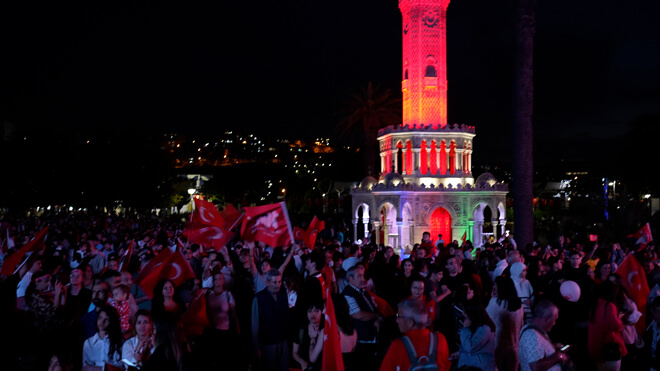 İzmir’in tarihi saat kulesinde kurulan ekrana, 29 Ekim akşam 19:23’te “Yüz Akıyla 100 Yıl” dijital sergisi yansıtıldı. Sergide, Türkiye’nin otomobili, olimpiyatlarda atıcılık branşında Türkiye’ye ilk madalyayı kazandıran Milli Sporcu Mete Gazoz, Nobel Ödüllü Türk Bilim İnsanı Aziz Sancar ve 2023 yılı içerisinde dünya şampiyonluğunu kazanan A Milli Kadın Voleybol Takımı’na yer veriliyor.