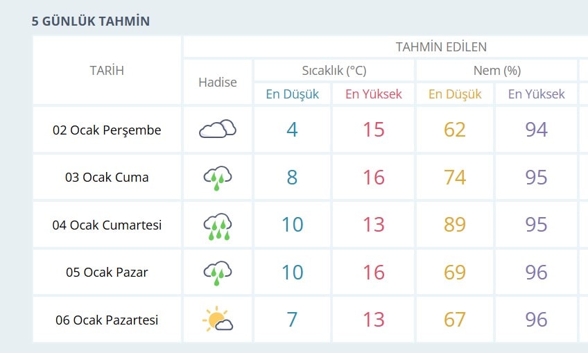 Hava sıcaklığının cuma günü 16 derece, cumartesi 13 derece, pazar günü 16 derece olacağı tahmin ediliyor.