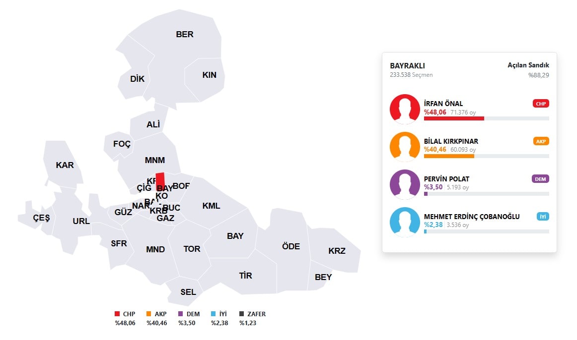 İzmir'in önemli ilçelerinden Bayraklı'da seçim yarışında son durum şöyle;
