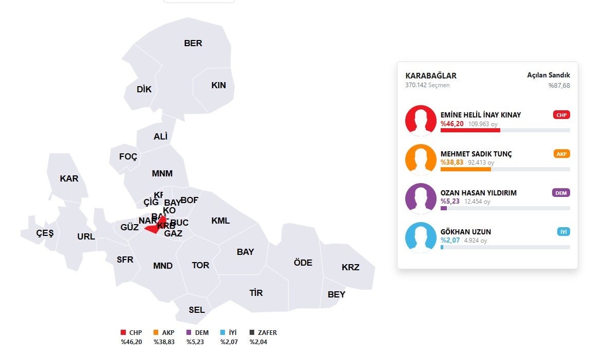 İzmir'in önemli ilçelerinden Karabağlar'da seçim yarışında son durum şöyle;