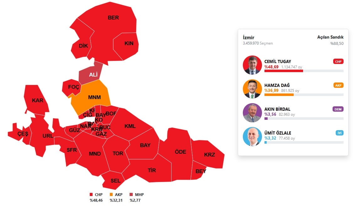 Resmi olmayan sonuçlara göre açılan sandıklarda CHP Büyükşehir Belediye Başkan Adayı Cemil Tugay, seçim yarışını önde tamamladı. CHP'li Tugay, yüzde %48,70'lik oy farkıyla seçimi başarıyla göğüsledi.