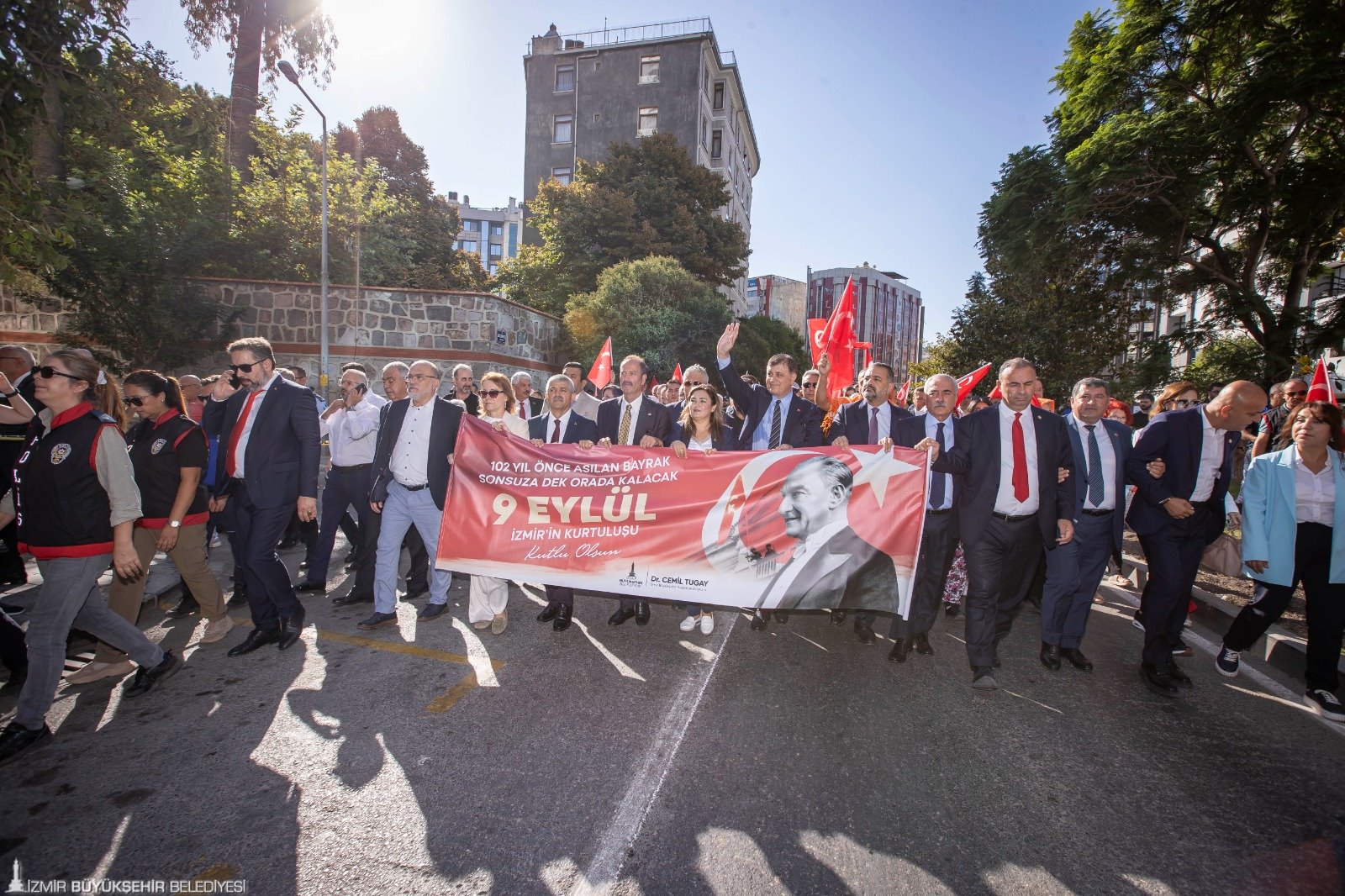 İzmir'de kurtuluşun 102'nci yıl dönümü kutlamaları kapsamında 9 Eylül Zafer Yürüyüşü düzenledi. Türk ordusunun 9 Eylül 1922'de İzmir'e girerken kullandığı güzergah üzerinde düzenlenen yürüyüş, Basmane Karakolu önünden Cumhuriyet Meydanı'na kadar devam etti. Yürüyüşe İzmir Büyükşehir Belediye Başkanı Dr. Cemil Tugay'ın yanı sıra CHP, AK Parti, MHP, İYİ Parti, Demokrat Parti milletvekilleri, siyasi parti temsilcileri, ilçe belediye başkanları, meclis üyeleri, bürokratlar, iş dünyası, sivil toplum örgütlerinin temsilcileri ve binlerce İzmirli katıldı.
