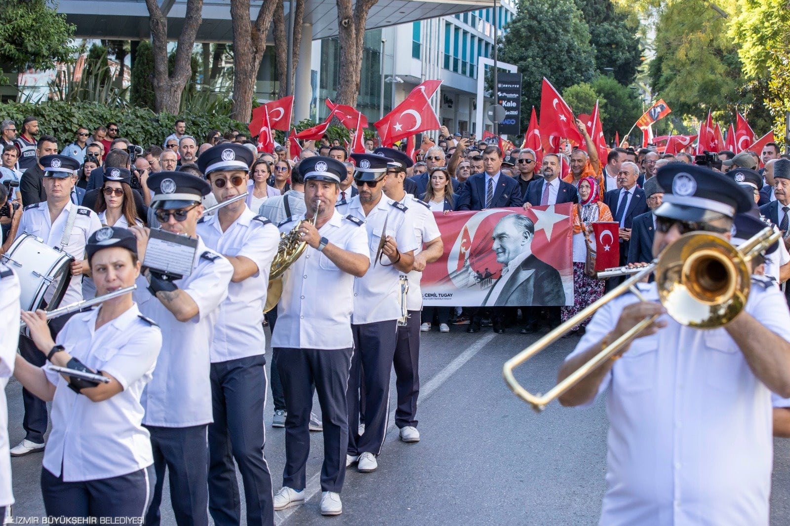İzmir Büyükşehir Belediyesi'nin hazırladığı 350 metre uzunluğundaki Atatürk posterini taşıyan katılımcılar Anafartalar ve İkiçeşmelik caddeleri üzerinden ilerledi. Yürüyüş coşkusu Cumhuriyet Meydanı'na kadar devam etti. Marşlar eşliğinde yürüyen korteje, vatandaşlar da alkışlarla eşlik etti. Duygularını aktaran İzmir Büyükşehir Belediye Başkanı Dr. Cemil Tugay, “Çok güzel bir yürüyüş gerçekleştiriyoruz, duyguluyuz. 102 yıl önceki büyük zaferin gururunu hala yaşıyoruz. Gün boyunca etkinliklerle kutlamaya devam edeceğiz. Bu yürüyüş başlangıç” dedi.