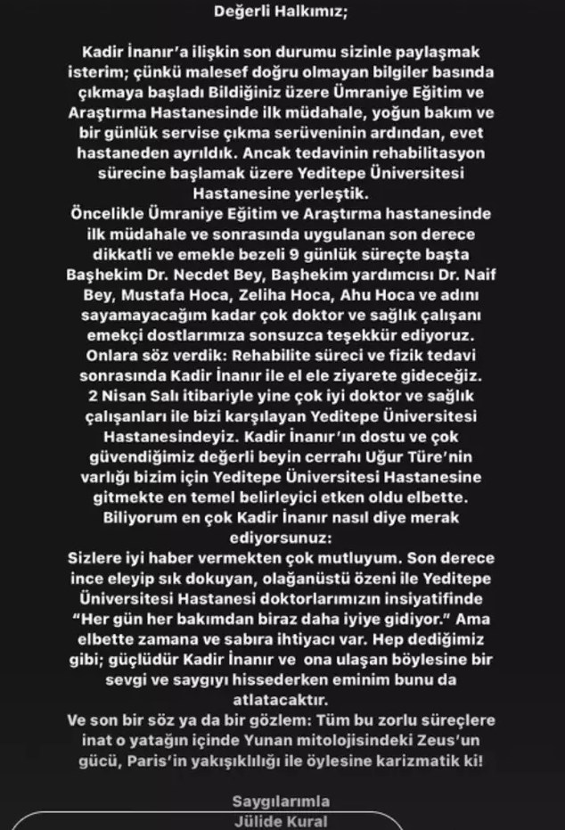 Jülide Kural; 'Kadir İnanır'a ilişkin son durumu sizinle paylaşmak isterim çünkü malesef doğru olmayan bilgiler basında çıkmaya başladı. Bildiğiniz üzere Ümraniye Eğitim ve Araştırma Hastanesi'nde ilk müdahale, yoğun bakım ve bir günlük servise çıkma serüveninin ardından, evet hastaneden ayrıldık. Ancak tedavinin rehabilitasyon sürecine başlamak üzere Yeditepe Üniversitesi Hastanesi'ne yerleştik' dedi.