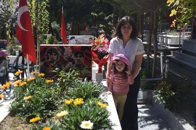 Kara Pilot Üsteğmen Volkan Koçyiğit'in 2009 yılında şehit olduğunu ifade eden eşi Seyran Koçyiğit (43), "Bu yıl 16'ncı yılımız. Kara pilot üsteğmendi. 29 yaşındaydı. Oğlum o zaman 3 yaşındaydı, şimdi 18 yaşında. Bayramda buradayız. Ama 16 yıldan beri bayram yaşamıyoruz" dedi.