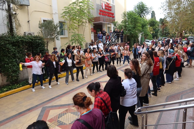 Ellerinde taşıdıkları pankartlarla kadına yönelik şiddetin önlenmesi için mesaj veren kadınlar adına Bornova Belediyesi önünde DİSK Genel İş Sendikası İzmir 7 No'lu Şube Başkanı Özgür Genç basın açıklaması yaptı. Bornova Belediye Başkanlığı adına Yazarlar Derneği'nin hazırladığı basın metnini BELGEM öğretmenlerinden Berrin Burakçı Bağış okudu. Özgür Genç, 1960 yılında Dominik'te Mirabel kardeşlerin diktatör güçleri tarafından katledilişinin üzerinden 63 yıl geçtiğini belirterek, "Savaşa, şiddete, eşitsizliğe, yoksulluğa ve kadın düşmanı politikalara karşı başta biz işçi kadınlar olmak üzere bütün bir işçi sınıfı olarak örgütlü gücümüzle mücadele ediyoruz, edeceğiz" dedi.