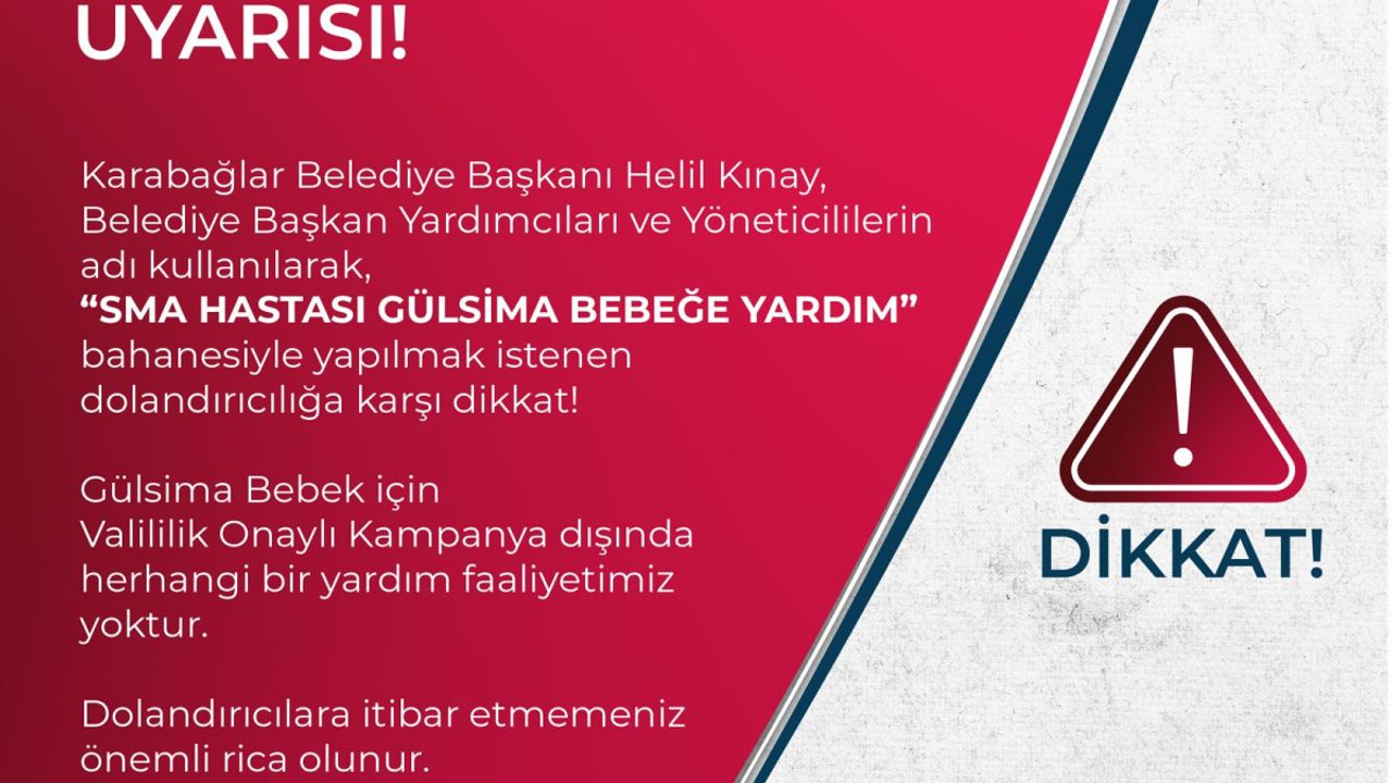 Kendilerini Karabağlar Belediyesi Başkanı Helil Kınay, belediye başkan yardımcıları, üst düzey yöneticiler ye da belediye personeli olarak olarak tanıtan bazı kişi ya da kişilerin, Karabağlar'da yaşayan SMA hastası Gülsima bebek için vatandaşlardan para istedikleri öğrenildi. Karabağlar Belediyesi'nden yapılan açıklamada, Gülsima bebek için valililik onaylı kampanya dışında herhangi bir yardım faaliyeti yürütülmediği hatırlatılarak, "Bu anlamda Karabağlar Belediyesi'nin de yürüttüğü bir yardım kampanyası bulunmamaktadır ve bunun için IBAN verilmesi kesinlikle söz konusu değildir. Vatandaşlarımızın bu tür olaylarla karşılaşmaları halinde durumu derhal emniyete bildirmeleri gerekmekte olup, herhangi bir talepte bulunarak kendilerinden yardım isteyen dolandırıcılara itibar etmemeleri önemli rica olunur" denildi.