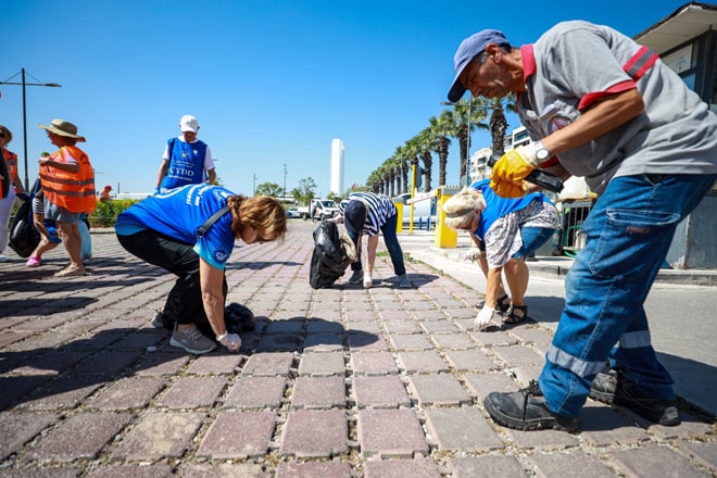 "Hedef Tertemiz Karşıyaka" kampanyası ile hem temizlik hizmetlerini yoğunlaştıran hem de vatandaşlara kurallara uyma çağrısı yapan Karşıyaka Belediyesi'ne anlamlı bir destek geldi. Karşıyaka Kent Konseyi ile Sancar Maruflu Sivil Toplum Yerleşkesi'nde çalışmalarını sürdüren 12 dernek, Karşıyaka sahilinde temizlik etkinliği gerçekleştirdi. Atatürk, Annesi ve Kadın Hakları Anıtı önünde bir araya gelen çevre gönüllüleri, Tersane'ye kadar ilerleyerek yerlere atılan çöpleri topladı. Çöpleri geri dönüşüm için atık türlerine göre ayıran katılımcılar, hem sahili temizledi hem de çevre kirliliğine karşı farkındalık yarattı.