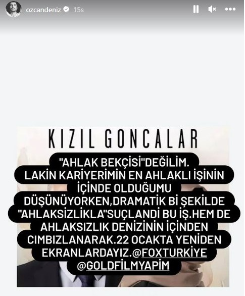 Instagram hesabından yaptığı paylaşımla içinde bulundukları duruma veryansın eden Deniz, "Ahlak bekçisi değilim. Lakin kariyerimin en ahlaklı işinin içinde olduğumu düşünüyorken, dramatik bir şekilde ahlaksızlıkla suçlandı bu iş. Hem de ahlaksızlık denizinin içinden cımbızlanarak. 22 Ocak'ta yeniden ekranlardayız" dedi.