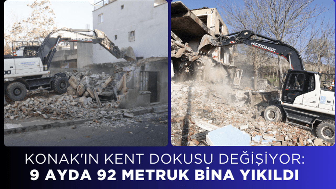 Kent estetiğini bozan ve çeşitli suçlara zemin hazırlamaları nedeniyle güvenlik tehdidi oluşturan bu binaları yıkmaya devam edeceklerini vurgulayan Konak Belediye Başkanı Nilüfer Çınarlı Mutlu, "Daha temiz ve güvenli bir Konak için durmaksızın çalışıyoruz. İlçemizdeki metruk binaların tamamını ortadan kaldırma anlayışımız doğrultusunda geçen 9 ayda 92 yıkım gerçekleştirdik. Bundan sonra da üzerimize düşen sorumluluğu yerine getirmeye devam edeceğiz" dedi. Bu binaların kent suçluları ve suçlarına yataklık etmesinin yanı sıra görsel kirlilik de oluşturduğuna dikkat çeken Başkan Mutlu, "Daha güzel bir Konak için vatandaşlarımız ve ilgili kamu kurumlarıyla birlikte hareket ediyoruz. Daha yaşanabilir bir ilçeyi hep birlikte oluşturacağız" ifadelerini kullandı.