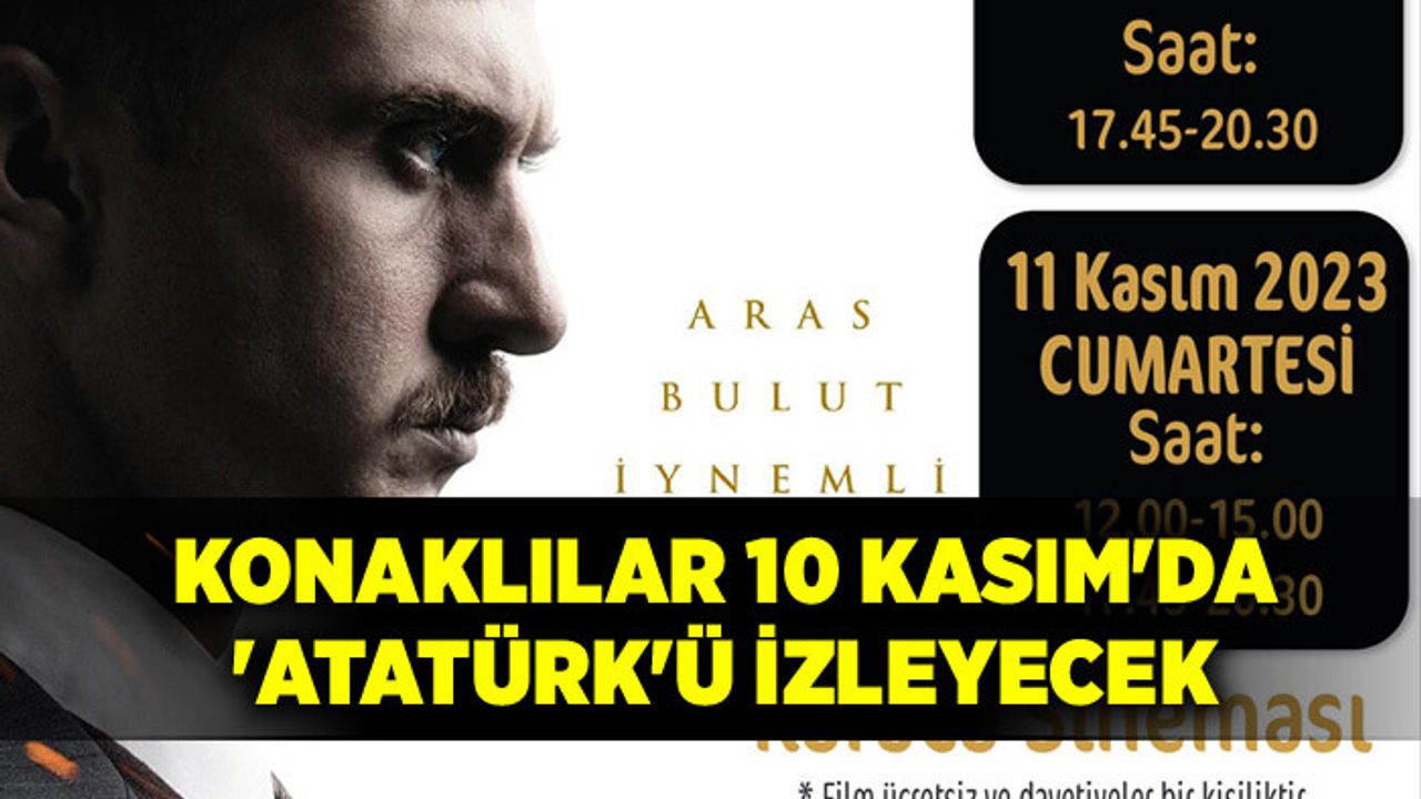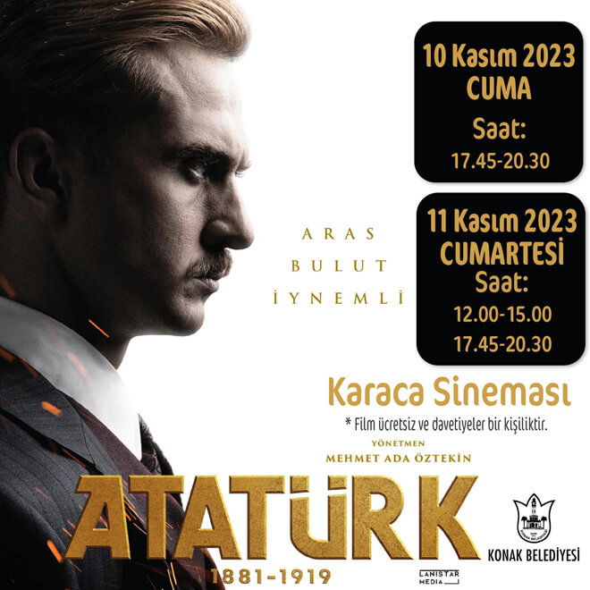 Mehmet Ada Öztekin'in yönetmenliğini yaptığı, yetenekli oyuncu Aras Bulut İynemli'nin ise Mustafa Kemal Atatürk'ü canlandırdığı filmin gösterimleri Karaca sinemasında yapılacak. Mustafa Kemal Atatürk'ün çocukluk yıllarından Milli Mücadele'ye giden yaşam öyküsünün anlatıldığı filmin 10 Kasım'daki gösteriminde Konak Belediye Başkanı Abdül Batur da seyirciler arasında yer alacak. Karaca sinemasında, 10 Kasım tarihinde saat 17.45 ve 20.30 seansları, 11 Kasım'da ise 12.00, 15.00, 17.45 ve 20.30 seansları için sınırlı sayıdaki ücretsiz davetiyeler 7 Kasım Salı günü saat 18.00'den itibaren Türkan Saylan Kültür Merkezi'nden temin edilebilecek.