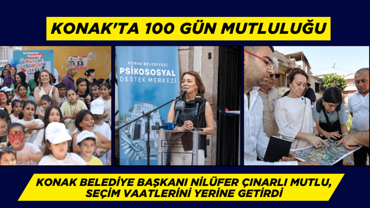 Konak Belediye Başkanı Nilüfer Çınarlı Mutlu, günden güne daha mutlu, daha yaşanır bir kent olma yolunda somut adımlarla ilerleyen Konak'taki 100 günlük hizmet sürecini değerlendirdi. Seçim vaatlerinin peş peşe hayata geçtiği ilk yüz günde, "Adil Kent, Eşit Yurttaş" vurgusuyla yol alınırken, önemli kentsel sorunlardan temizlik, metruk bina, işgal, doğalgaz ve kentsel dönüşüme ağırlık verildi. Başkan Mutlu'nun seçim vaatleri arasında yer alan istihdama yönelik "İş'te Konak Personel İstihdam Ofisi", emeklilerin yeni adresi "Mutluluk Kahvesi" ve Konaklıların asla yalnız olmadığını hissettiği "Psikososyal Destek Merkezi" art arda hizmete açıldı.
