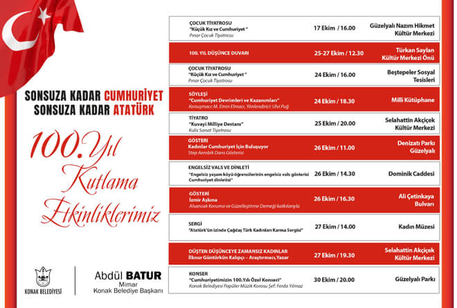 Konak Belediyesi Cumhuriyet'in 100. yaşı onuruna 27 Ekim'de Kadın Müzesi'nde "Atatürk'ün İzinde Çağdaş Türk Kadınları" sergisini açacak. Araştırmacı Yazar İlknur Güntürkün Kalıpçı'nın "Düşten Düşünceye Zamansız Kadınlar" isimli teatral gösterisi de 27 Ekim'de Selahattin Akçiçek Gösteri Merkezi'nde düzenlenecek. Türkan Saylan Kültür Merkezi önünde kurulan 100. Yıl Düşünce Duvarı ise 25-27 Ekim tarihleri arasında görülebilecek. 30 Ekim'de Güzelyalı Parkı'nda düzenlenecek "Cumhuriyetimizin 100. Yılı Özel Konseri" de İzmirlilere 100. yıl heyecanıyla dolu muhteşem bir gece yaşatacak. Konserde Konak Belediyesi Popüler Müzik Korosu, Şef Ferda Yılmaz yönetiminde dinleyicileriyle buluşacak.