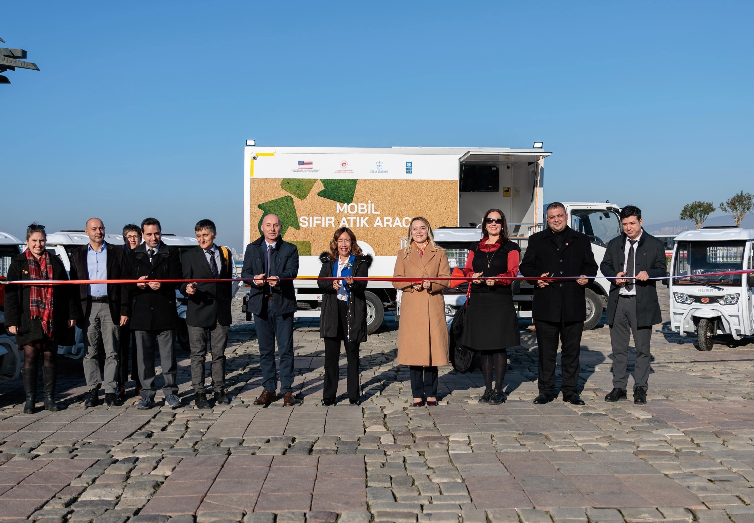 Konak Belediye Başkanı Nilüfer Çınarlı Mutlu, belediyenin filosuna yeni araçlar kazandırma sözünün bir kez daha arkasında durdu. Geçtiğimiz günlerde Devlet Malzeme Ofisi'nden (DMO) alınarak kontak çalıştıran çöp kamyonlarının ardından şimdi de "Kapsayıcı Sıfır Atık Yönetimi ile Sosyal Uyumun Güçlendirilmesi Projesi" kapsamında 1 adet Mobil Atık Toplama Kamyonu ve 10 adet elektrikli triportör hizmete kazandırıldı. Birleşmiş Milletler Kalkınma Programı (UNDP) Türkiye ve Çevre, Şehircilik ve İklim Değişikliği Bakanlığı iş birliğinde yürütülen proje çerçevesinde belediyeye hibe edilen araçlar, Alsancak Gündoğdu Meydanı'nda düzenlenen törenle teslim alındı. Törene Başkan Nilüfer Çınarlı Mutlu'yla birlikte Birleşmiş Milletler Kalkınma Programı (UNDP) Türkiye Mukim Temsilcisi Monica Merino, UNDP Türkiye Mukim Temsilci Yardımcısı Miodrag Dragisic, UNDP Türkiye Portföy Yöneticisi Cem Bayrak, UNDP Türkiye Bölge Koordinatörü Güvenç Küçüktok, UNDP Türkiye Proje Koordinatörü Didem Köseoğlu, Hayata Destek Derneği Proje Yöneticisi Müge Yamanyılmaz, Konak Belediyesi Meclis Üyeleri ve belediye bürokratları katıldı. Yeni mobil araçlar sayesinde Konak Belediyesi'nin geri dönüşüm atıklarını daha hızlı ve etkin şekilde toplamasını sağlayacak ve çevre korumada önemli bir adım atılmış olacak.