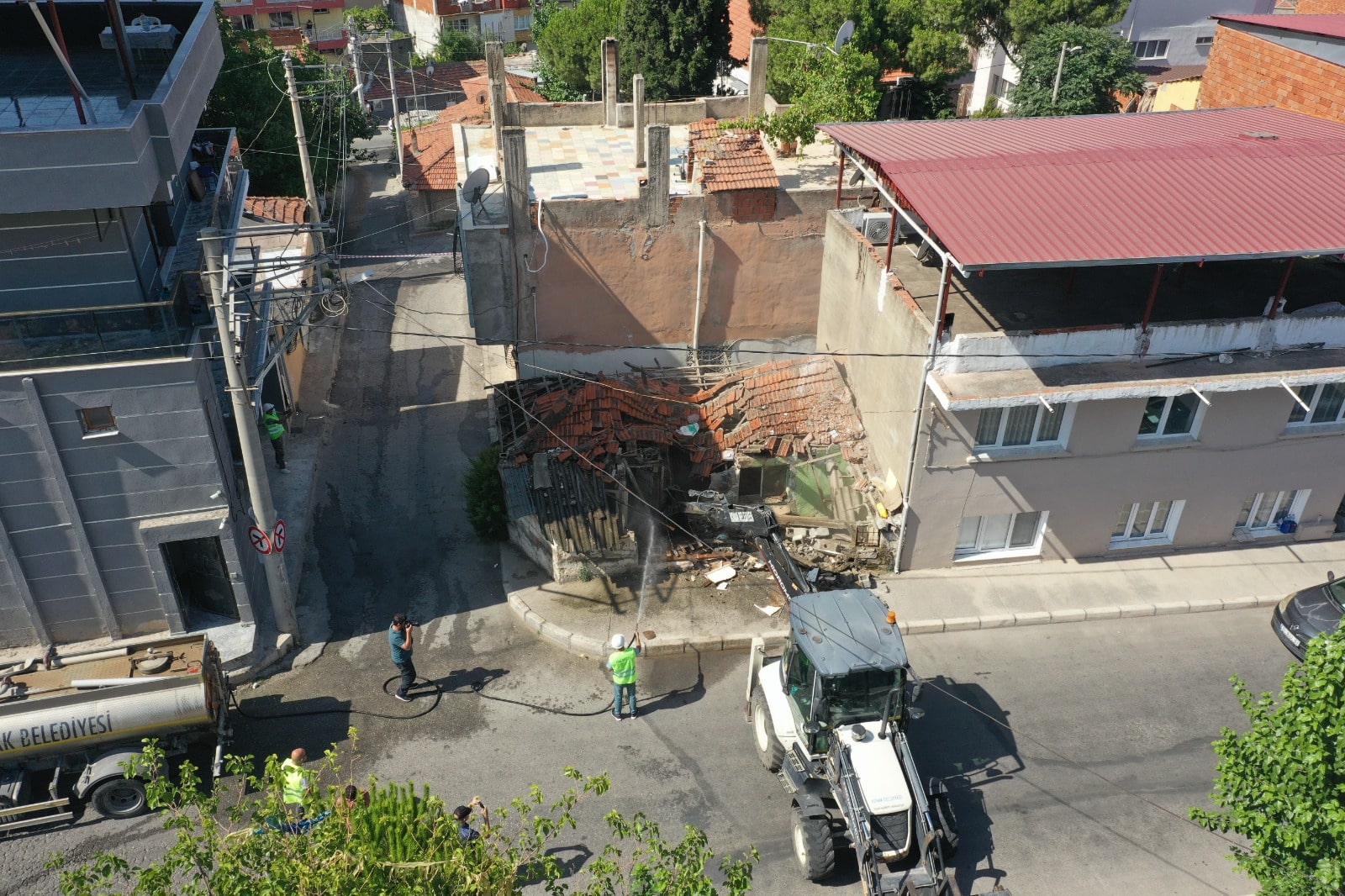 Konak Belediyesi, ilçe estetiğini bozan ve kamu güvenliğine karşı risk oluşturan metruk binalara karşı çalışmalarını sürdürüyor. Konak Belediyesi Fen İşleri Müdürlüğüne bağlı yıkım ekipleri, son olarak Yapı Kontrol Müdürlüğü tarafından tehlikeli yapı raporu tutulmuş olan Ferahlı Mahallesi 3499 Sokak’ta bulunan metruk yapının yıkımını gerçekleştirdi. Delici ve kepçe yardımıyla yıkımı kısa sürede gerçekleşen yapıdaki çalışma sırasında çevreye toz yayılmasını engellemek için yıkım süresince arazözle sulama yapıldı.