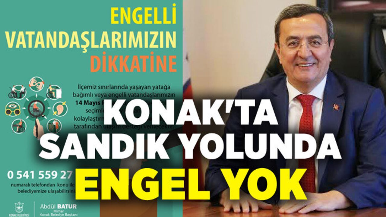 Konaklı seçmenlerin hiçbir zorlukla karşılaşmadan oylarını kullanmalarını istediklerini ifade eden Konak Belediye Başkanı Abdül Batur, "Hemşehrilerimizin huzur ve güven ortamı içinde, demokratik hakları olan oy verme işlemini gerçekleştirmelerini istiyoruz. Bu nedenle biz de yerel yönetim olarak tüm imkânlarımızı seferber ediyoruz. Engelli hemşehrilerimizin de 14 Mayıs'ta oy kullanacakları okullara zahmetsizce ulaşmalarını sağlamak istedik. Bu nedenle ulaşım desteği sağlıyoruz. Bu demokratik hakkın önünde hiçbir engel olamaz. Biz de bu desteğimizle yanlarında olacağız" diye konuştu.