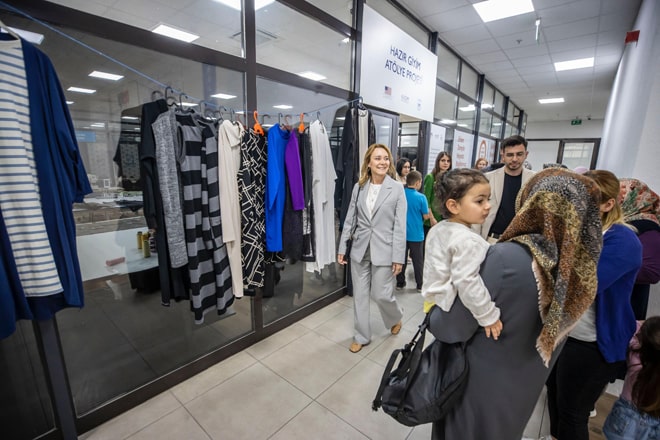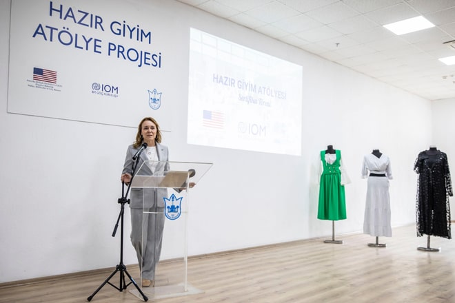 Sertifika törenin ardından Başkan Mutlu, IOM yetkilileriyle birlikte atölyede incelemede bulundu. Temel dikiş tekniklerinden ileri tasarım becerilerine kadar birçok konuda eğitim alan kadınların özellikle kadın giyim üzerine olan çalışmalarından oluşan sergiyigezdi. Göçmen ve yerel halka dikiş ve tasarım eğitimi vererek meslek edindirmeyi ve ekonomiye katkıda bulunmayı amaçlayan projenin ilk etabında eğitimlerini tamamlayan kursiyerlerin, ürettikleri giyim ürünleri takdir topladı.