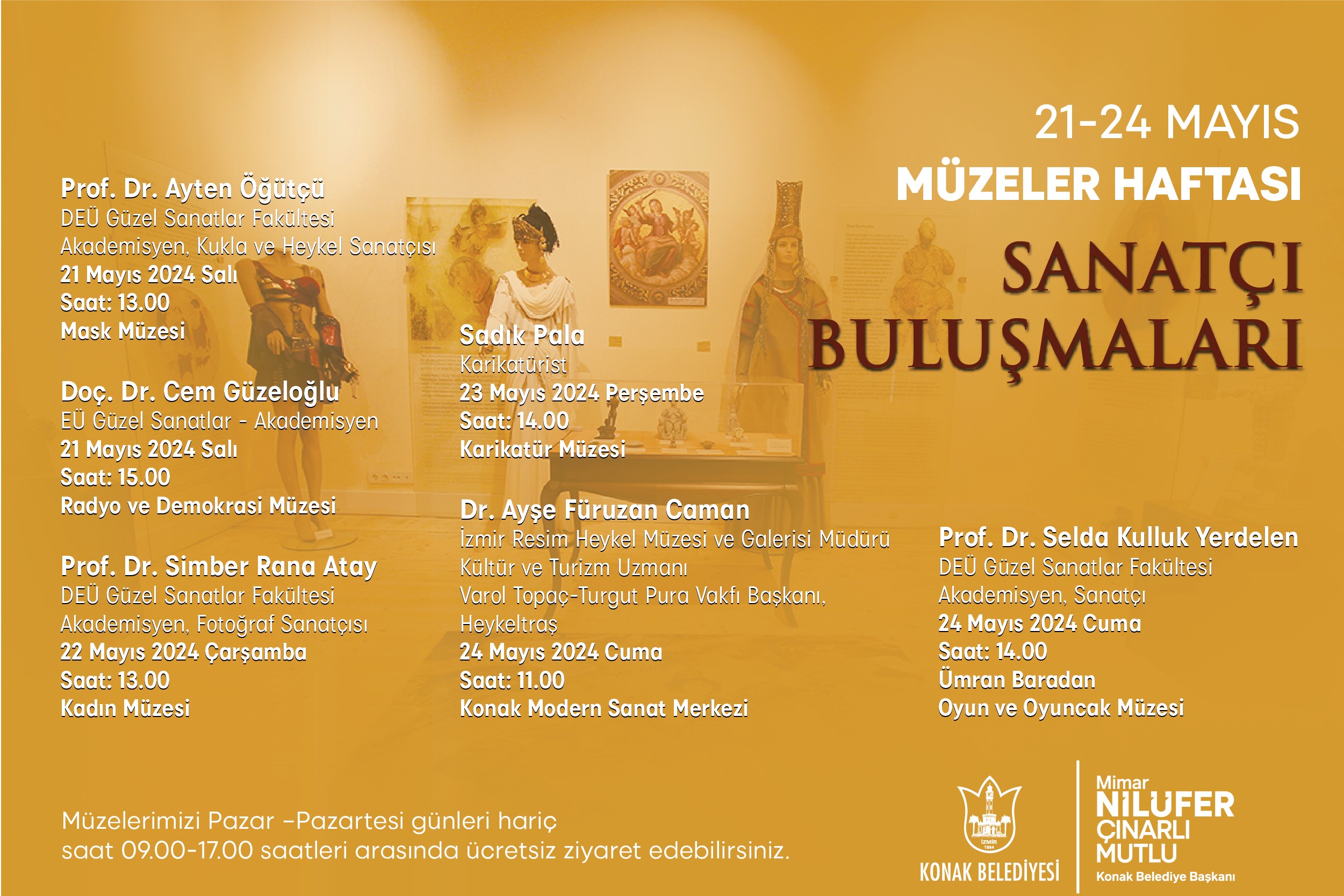 Müzeler Haftası'nı "Müzeler insanlığın kültürel mirasını geleceğe taşıyan birer köprüdür" sözleriyle kutlayan Konak Belediye Başkanı Nilüfer Çınarlı Mutlu, İzmirlileri Sanatçı Buluşmalarına davet etti. Sergi ve söyleşilerin yer aldığı etkinliklerin yer aldığı Sanatçı Buluşmaları programı ise şöyle:
