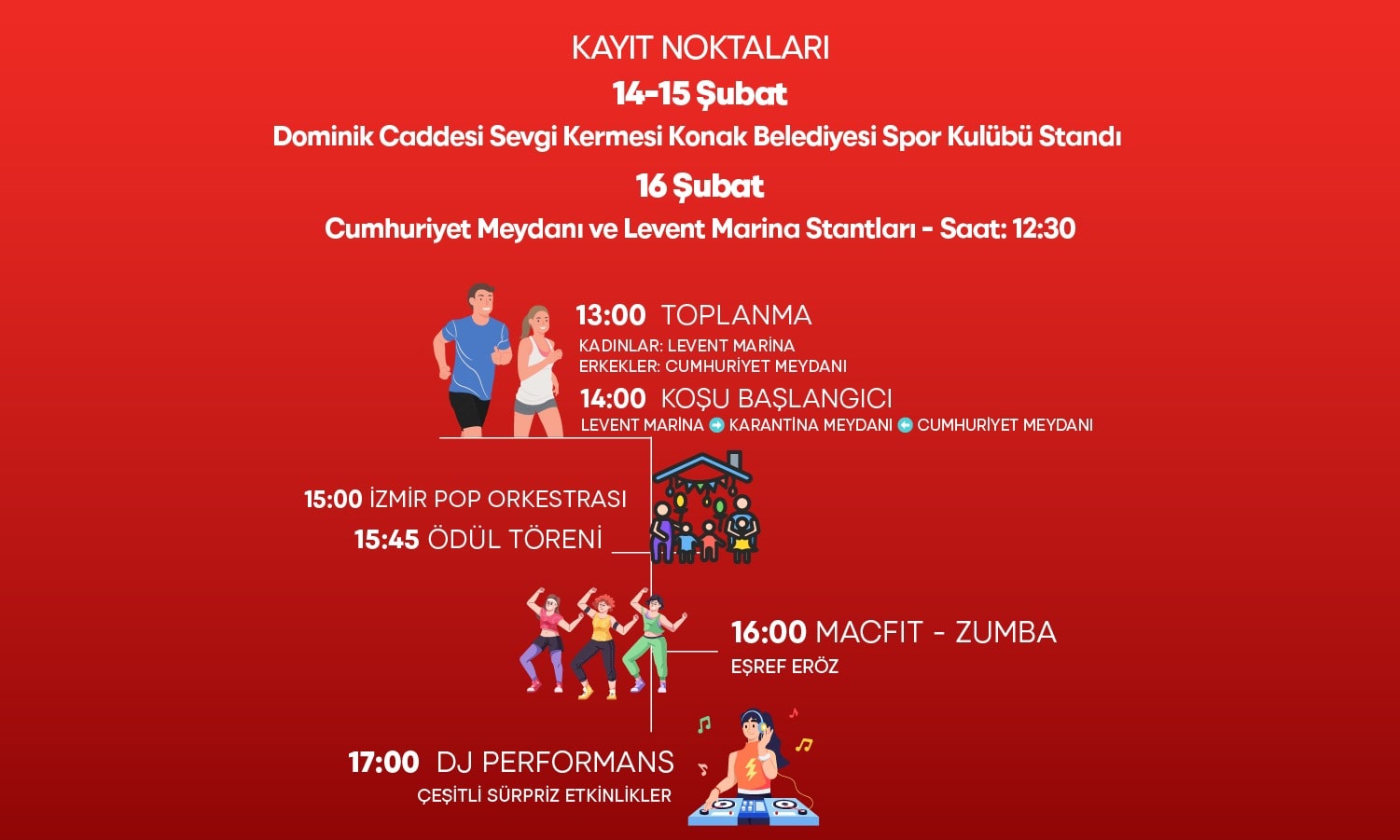 Sevgililer Günü etkinliklerinin finali 16 Şubat'ta Sevdiğine Koş koşusu olacak. Bu özel etkinlikte kadınlar Levent Marina'dan, erkekler Cumhuriyet Meydanı'ndan koşuya başlayacak Karantina Meydanı'nda (Demokrasi Şehitleri Meydanı) seven sevdiğine kavuşacak. Koşuya katılmak isteyenler etkinlik tarihine kadar Dominik Caddesi'nde, etkinlik günü ise başlangıç noktalarında kayıt yaptırabilecek.
