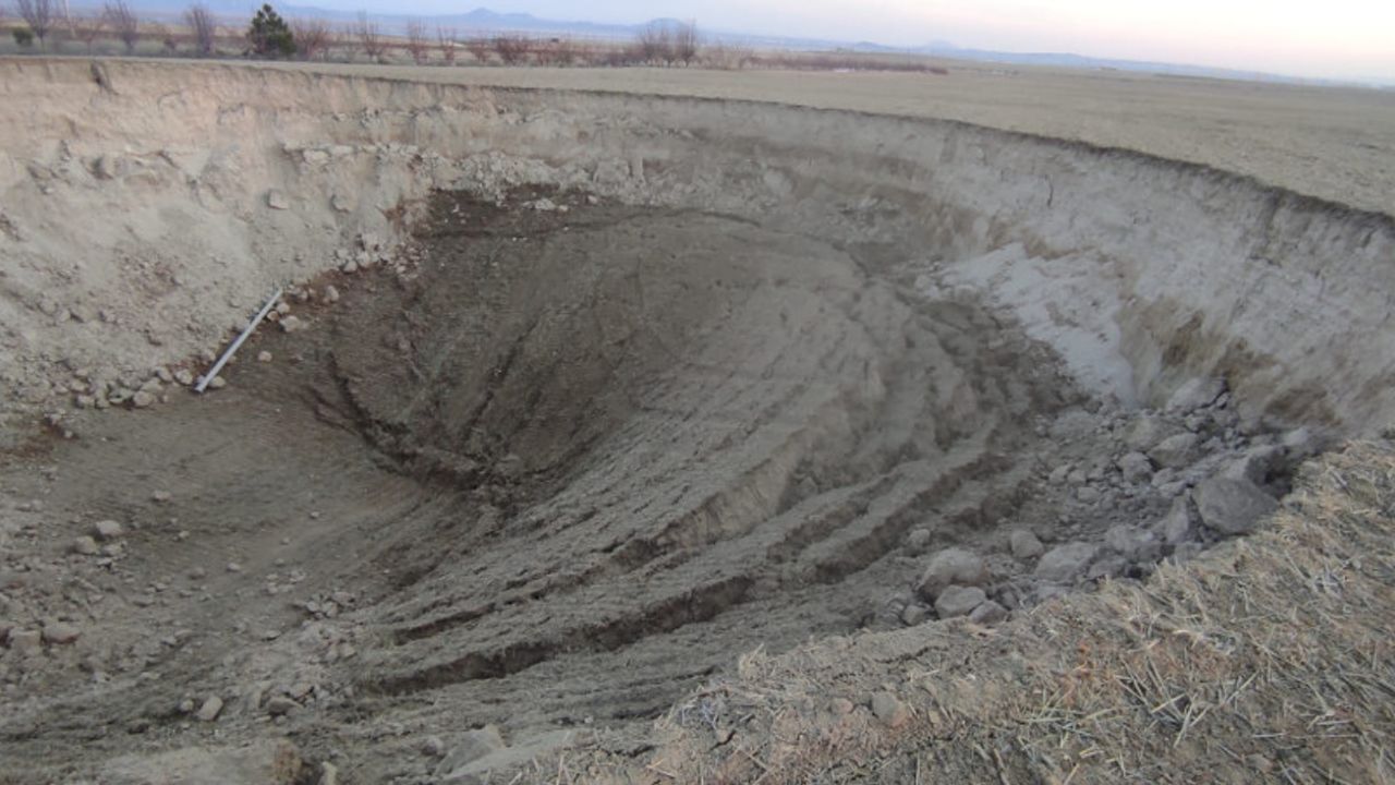 KONYA'nın Karapınar ilçesinde, boş bir tarlada 100 metre çapında, 15 metre derinliğinde obruk oluştu.