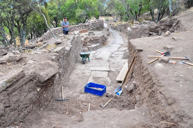 Athena Caddesi'ndeki antik yolda çok büyük boyutlu blok taşlar kullanıldığını söyleyen Prof. Dr. Yusuf Sezgin, "Yolun bir tarafından kanalizasyon geçiyor, kanal kapakları var. Biz o kanal kapaklarını yeri geldiğince tamir ettik. Yolların kenarlarındaki binaların kapılarının da ortaya çıkmasıyla birlikte önemli bir yol" dedi.