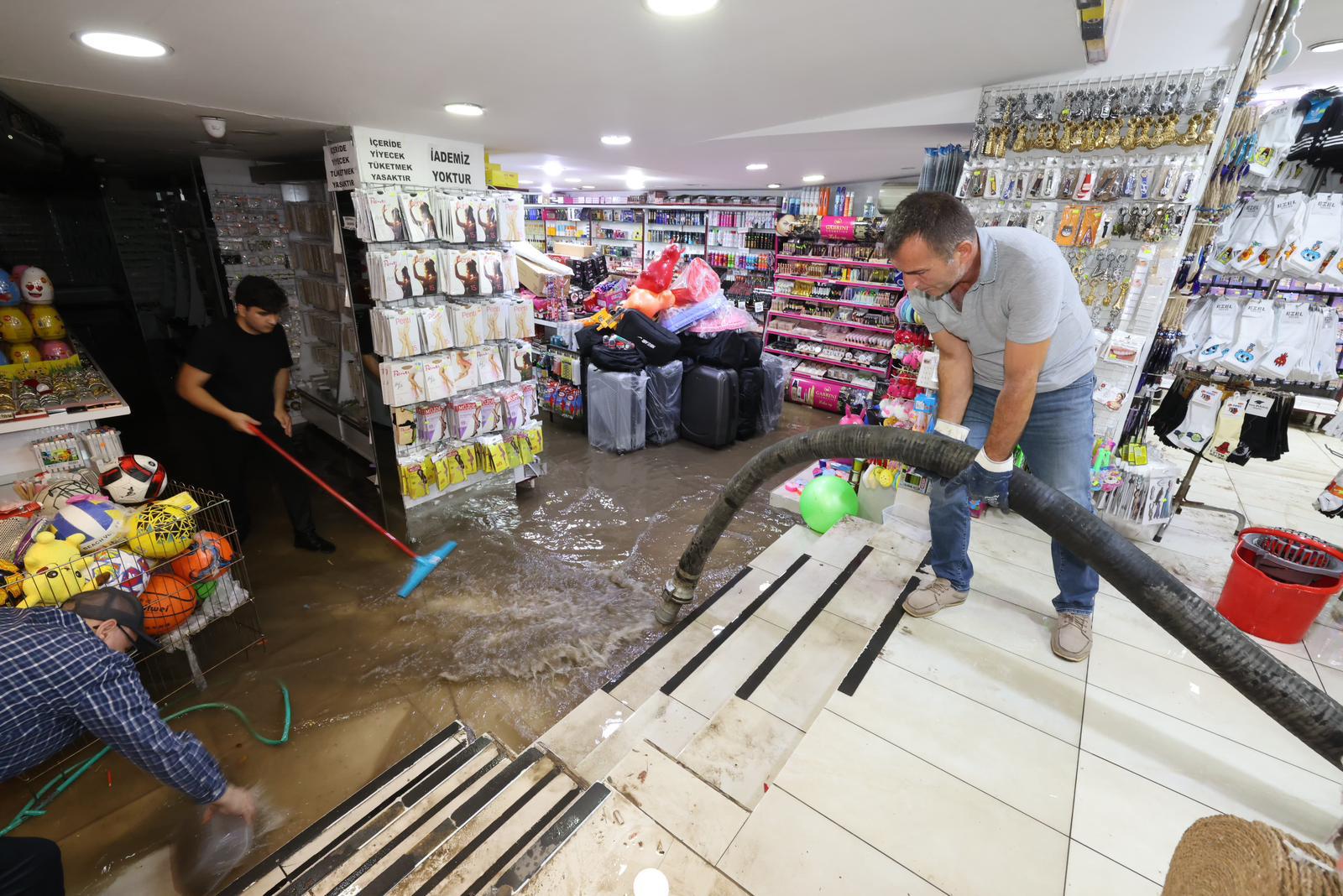 İzmir Büyükşehir Belediyesi'nin çeşitli birimlerine bağlı ekipler su baskını yaşanan bölgelerde pompalar, iş makineleri ve kanal araçlarıyla su tahliye çalışmalarına katıldı.