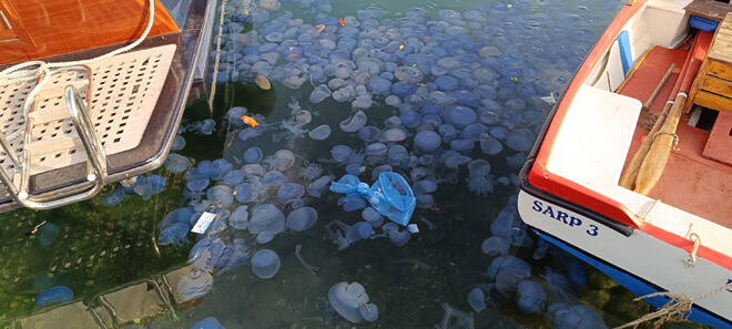 Foça Büyükdeniz ve Küçükdeniz limanları sahilinde yaz sezonu boyunca büyüklü, küçüklü denizanası yoğunluğu görüldü. Tatilcileri tedirgin eden koyu mavi renkli ve uzun kuyruklu denizanaları, yaz sezonunun bitmesine rağmen eylül ayı boyunca da görülmeye devam etti. İzmir Katip Çelebi Üniversitesi Su Ürünleri Fakültesi'nde görevli Dr. Öğretim Üyesi Erhan Irmak denizanalarının hala görülmesine yönelik, "Ortada normal olmayan bir gelişme var. Şu an denizanalarının sayılarında zaman zaman artış oluyor. Akıntı ve hakim rüzgar yönüne bağlı olarak bu değişiklik gösteriyor. Foça'nın iç bölgelerine doğru yığılma yapıyorlar. Bu durum insan kaynaklı olarak ekosistemin bozulmasından ileri geliyor. Ekosistemin kaldırma kapasitesini aşmış durumdayız" dedi.