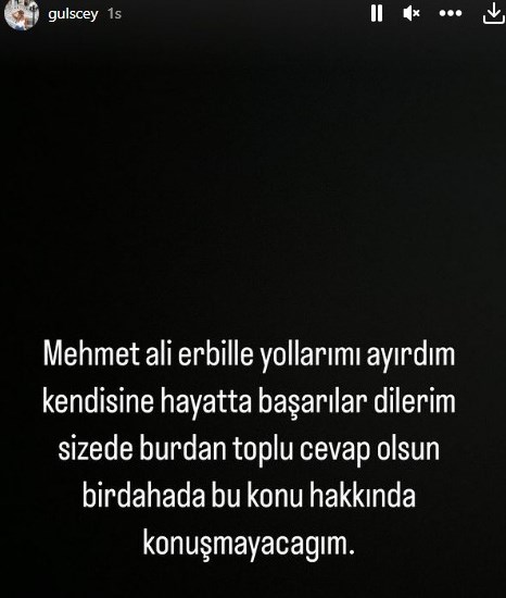 Önümüzdeki günlerde nikah masasına oturmaya hazırlanan çiftten ayrılık haberi geldi. Instagram hesabından paylaşım yapan Gülseren Ceylan, "Mehmet Ali Erbil ile yollarımı ayırdım. Kendisine hayatta başarılar dilerim. Size buradan toplu cevap olsun, bir daha bu konu hakkında konuşmayacağım" ifadelerini kullandı. Mehmet Ali Erbil, ayrılık sonrası bir açıklama yapmazken çift Instagram hesaplarından birbiriyle olan fotoğrafları sildi.