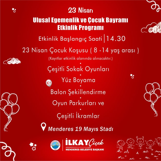 23 Nisan’da bayram coşkusunu çocuklara en iyi şekilde yaşatacaklarını ifade eden Menderes Belediye Başkanı İlkay Çiçek, “Ata'mızın tüm dünya çocuklarına armağanı olan bu özel günde biz de çocuklarımız için özel bir program hazırladık. 23 Nisan'da tüm çocuklarımız ve aileleri başta olmak üzere içinde ki çocuk ruhunu kaybetmeyen tüm vatandaşlarımızı Menderes'imize bekliyoruz." dedi.