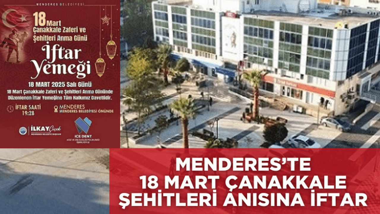 Menderes Belediyesi, 18 Mart Çanakkale Zaferi ve Şehitleri anma gününde şehitler anısına iftar yemeği verecek. Belediye önünde gerçekleşecek programa tüm halk davet edildi. 18 Mart Salı Günü’ne denk gelen iftarda oruç açma saatinin 19:28 olduğu hatırlatıldı.