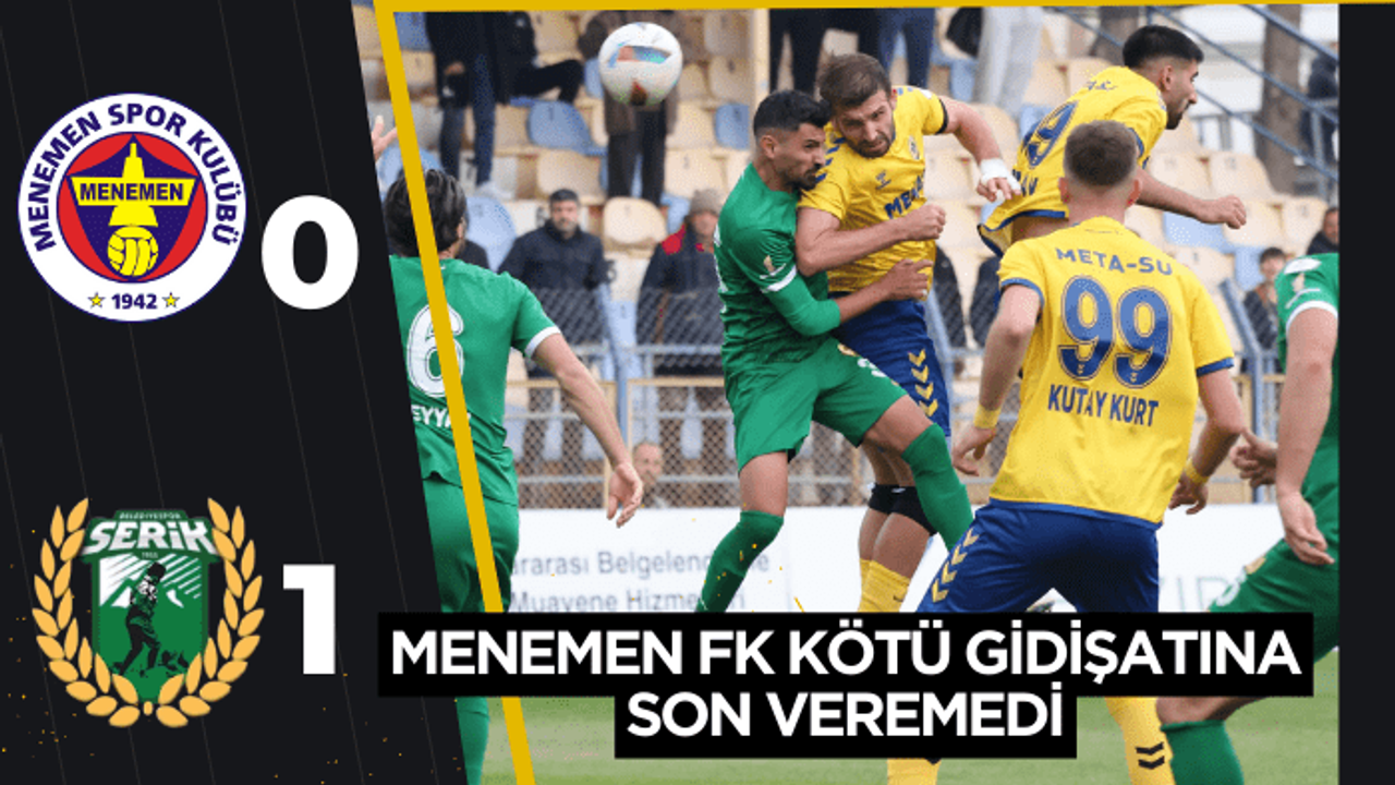 Serik Belediyespor maçın 43'üncü dakikasında Erhan Çelenk'in golüyle öne geçti ve ilk devreyi 1-0 önde tamamladı. İkinci yarıda ise iki takımın çabaları sonucu değiştirmedi, Menemen FK kötü gidişatına son veremedi. Bu sonucun ardından Menemen FK 28 puanda kaldı, Serik Belediyespor ise puanını 36 yaptı ve liderliğini korudu.