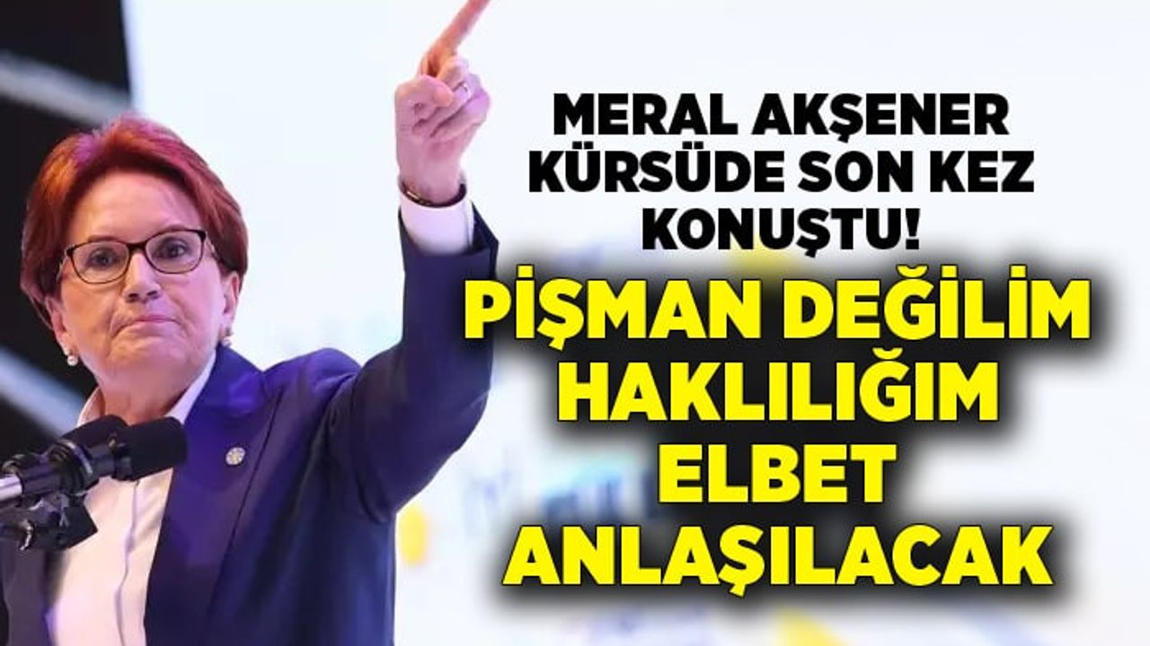 Akşener, partisi adan aldığı tüm kararların arkasında durduğunu kaydederek, "Ne kadar zorlu bir yola çıktığımızın farkındaydım. İftiralarla, karalamalarla, çirkin oyunlarla üzerimize gelineceğinin farkındaydım. Satın alınmışlara karşı yürekten inanmışların mücadelesini yürüttüğümüzün farkındaydım. Taşın altına elini, gövdesini koyanların farkında olduğum gibi o taşın bizi ezmesi için çalışanların da iştahla el ovuşturanların da elbette farkındaydım. Ezcümle seçim sonuçları doğrultusunda aldığımız riskin elbette farkındaydım. İşte bu yüzden bugüne kadar olduğu gibi bugün de Türkiye'nin alıştırılmış normallerinin dışında sadece söz söyleme sırasında değil, bedel ödeme sırasında da en önde karşınızda duruyorum. Bugün üzerime düşen her şeyi yapmış olmanın huzuruyla son kez karşınızdayım. Hiçbir hesaba, hiçbir pazarlığa, hiçbir sahtekarlığa girmeden milletin sesini duyurmuş olmanın mutluluğuyla son kez karşınızdayım. İYİ Parti olarak varlığımızı, onurumuzu, duruşumuzu pazarlık masalarına meze ettirmemiş olmanın gururuyla son kez karşınızdayım. İYİ Parti'yi kurduğumuz ilk günkü gibi bir an bile pes etmeden mücadele etmiş olmanın gönül rahatlığıyla son kez karşınızdayım. Allah herkese böyle veda etmeyi nasip eylesin" ifadelerini kullandı.