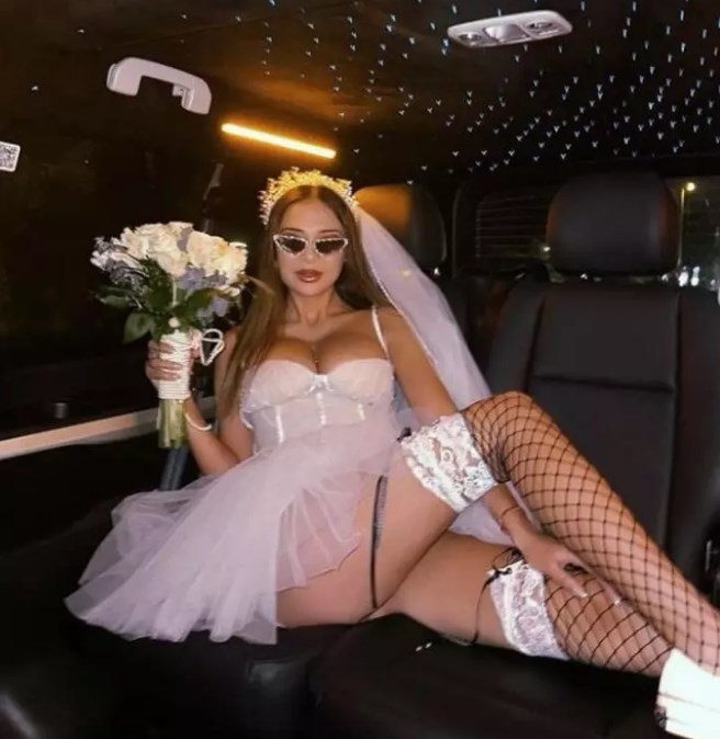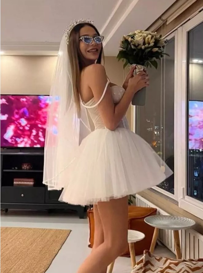 Göğüslerinin yarısını açık bırakan mini gelinliğiyle pozlar veren Merve Taşkın yine hayranlarını mest etti.