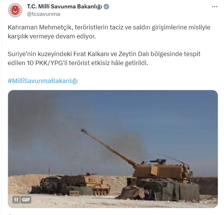 Bakanlığın sosyal medya hesabından yapılan açıklamada, "Kahraman Mehmetçik, teröristlerin taciz ve saldırı girişimlerine misliyle karşılık vermeye devam ediyor. Suriye’nin kuzeyindeki Fırat Kalkanı ve Zeytin Dalı bölgesinde tespit edilen 10 PKK/YPG'li terörist etkisiz hale getirildi" denildi.