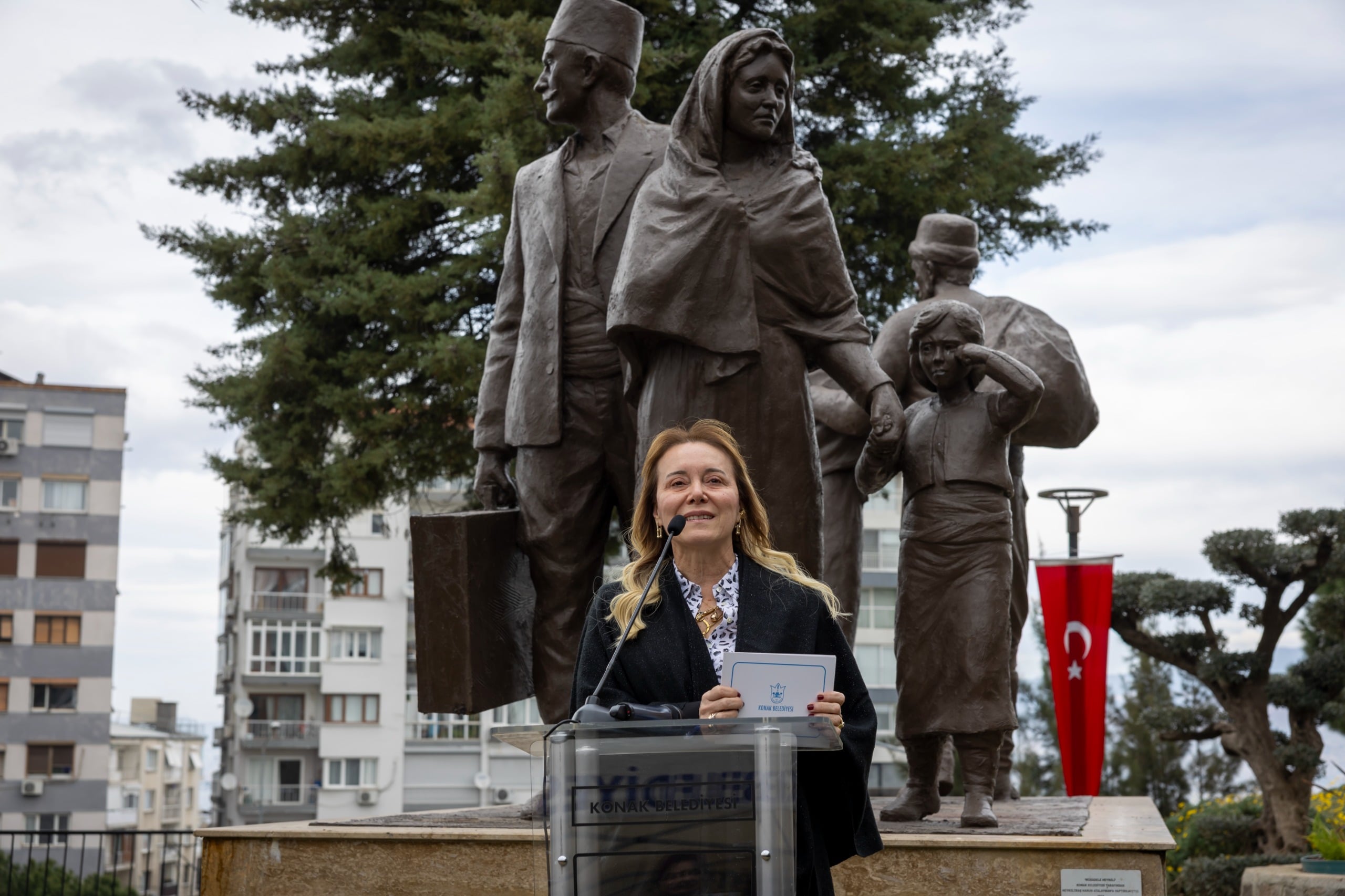 Törende konuşan Konak Belediye Başkanı Nilüfer Çınarlı Mutlu, insanların tüm hayatlarını bir küçük bavula sığdırıp çıktığı yolculuğun anılarıyla büyüdüğünü belirtti ve şunları söyledi: "Bugün, bu anıtın başında ailelerimizin acıklı yolculuğunu anıyoruz aslında. Ben de o yolculuğun hikayeleriyle büyüdüm. Bebeğinin öldüğü anlaşılır da denize atılır korkusuyla yolculuk boyunca gemide, bebeğini kucağında tutan kadınların öyküleriyle büyüdüm. Toprağınızdan, doğup büyüdüğünüz yerlerden ayrılmak; her şeyinizi o an taşıyabildiğiniz kadar bir bavula ya da bir bohçaya sığdırıp ayrılmak, çok çok acı bir yolculuk. Ama ne mutlu ki Anadolu'da, İzmir'de, İzmir'in farklı ilçelerinde kendilerine yeni bir yaşam alanı kurmuşlar ve burayı, Anadolu'yu, vatanları bellemişler. Bizler de bugün burada, onların aziz hatıraları önünde saygıyla eğiliyoruz."