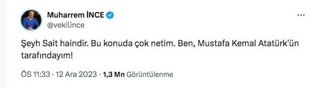 İnce sosyal medya hesabından yaptığı paylaşımda "Şeyh Sait haindir. Bu konuda çok netim. Ben, Mustafa Kemal Atatürk'ün tarafındayım!" dedi.