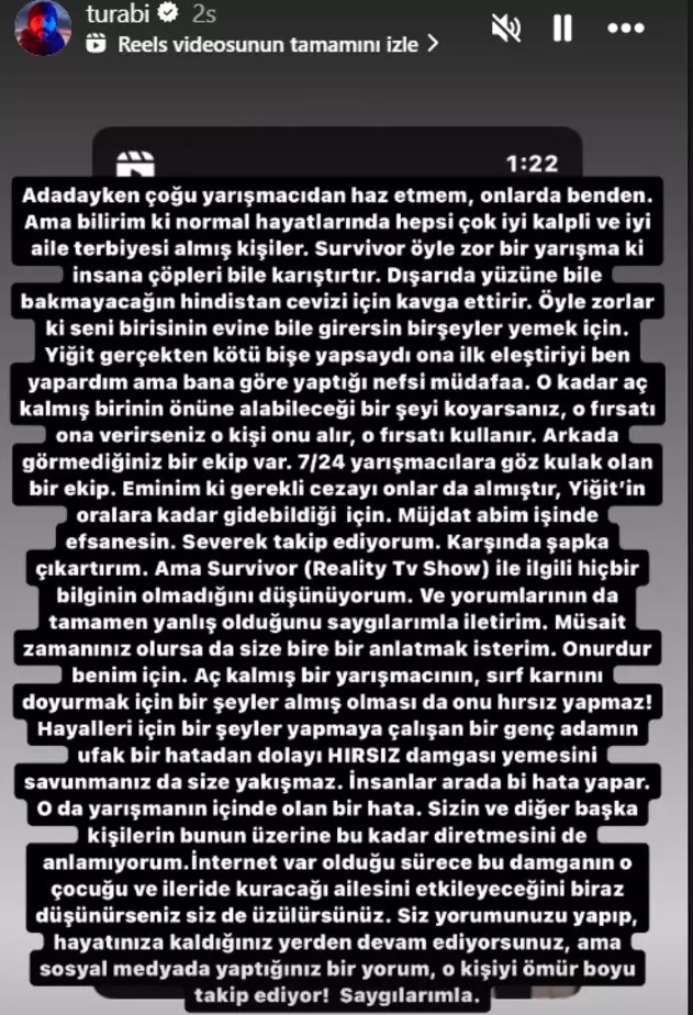 "Adadayken çoğu yarışmacıdan haz etmem, onlar da benden ama bilirim ki normal hayatlarında hepsi çok iyi kalpli ve iyi aile terbiyesi almış kişiler... Survivor öyle zor bir yarışma ki insana çöpleri bile karıştırtır. Dışarıda yüzüne bile bakmayacağın hindistan cevizi için kavga ettirir. Öyle zorlar ki seni birisinin evine bile girersin bir şeyler yemek için. Yiğit gerçekten kötü bir şey yapsaydı ona ilk eleştiriyi ben yapardım. Ama bana göre nefsi müdafaa. O kadar aç kalmış birinin önüne alabileceği bir şey koyarsanız, o fırsatı ona verirseniz o kişi onu alır, o fırsatı kullanır. Arkada görmediğiniz bir ekip var. 7/24 yarışmacılara göz kulak olan bir ekip. Eminim ki gerekli cezayı onlar da almıştır. Yiğit'in oralara kadar gidebildiği için... Müjdat abi işinde efsanesin. Severek takip ediyorum. Karşında şapka çıkartıyorum. Ama "Survivor Reality Tv Show" ile ilgili hiç bir bilginin olmadığını düşünüyorum. Ve yorumlarının da tamamen yanlış olduğunu saygılarımla iletirim. Müsait zamanınız olursa da size birebir anlatmak isterim. Onurdur benim için... Aç kalmış bir yarışmacının, sırf karnını doyurmak için bir şeyler almış olması da onu hırsız yapmaz. Hayalleri için bir şeyler yapmaya çalışan genç adamın ufak bir hatadan dolayı hırsız damgasını yemesini savunmanız da size yakışmaz.